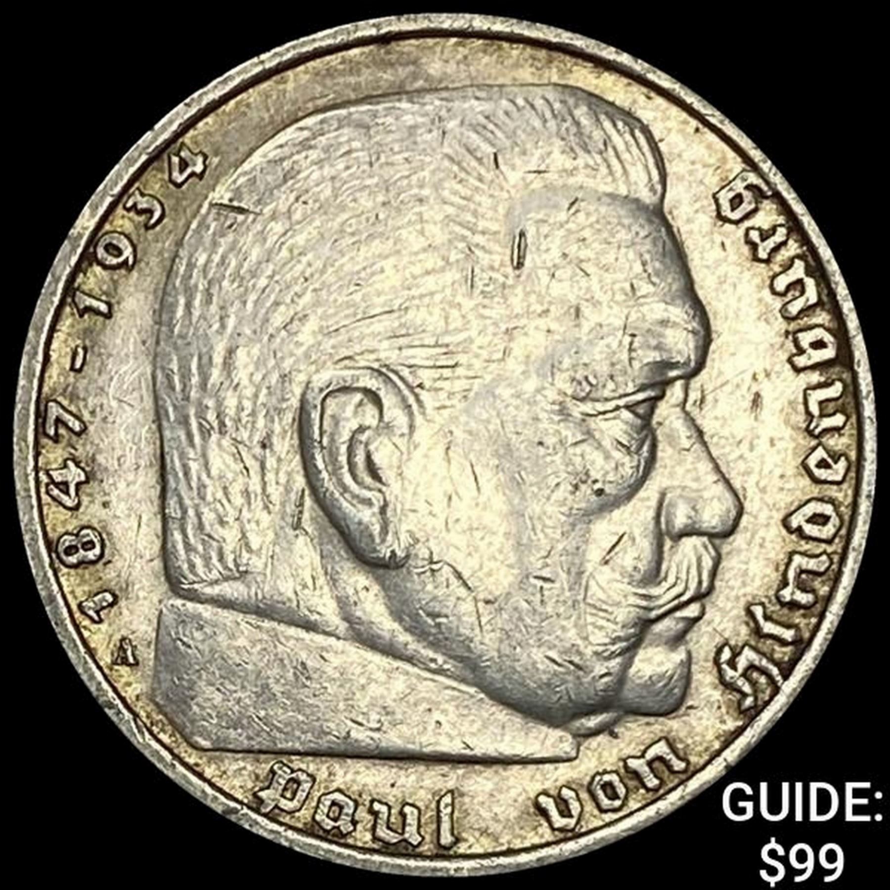 1939-A Germany Silver 5 Riechsmark CLOSELY UNCIRCULATED