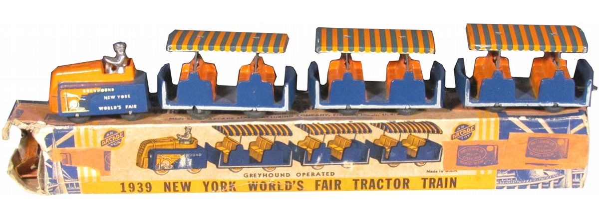 1939 Arcade New York World's Fair Toy Tractor Train. Greyhound operated. Excellent condition in original box, box shows age. 16 inches long.