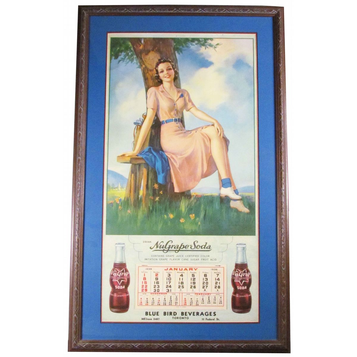 1939 Calendar for Nu Grape Soda. Depicting girl sitting by a tree. Full pad, excellent condition. Framed and matted. 13 X 25 image only.