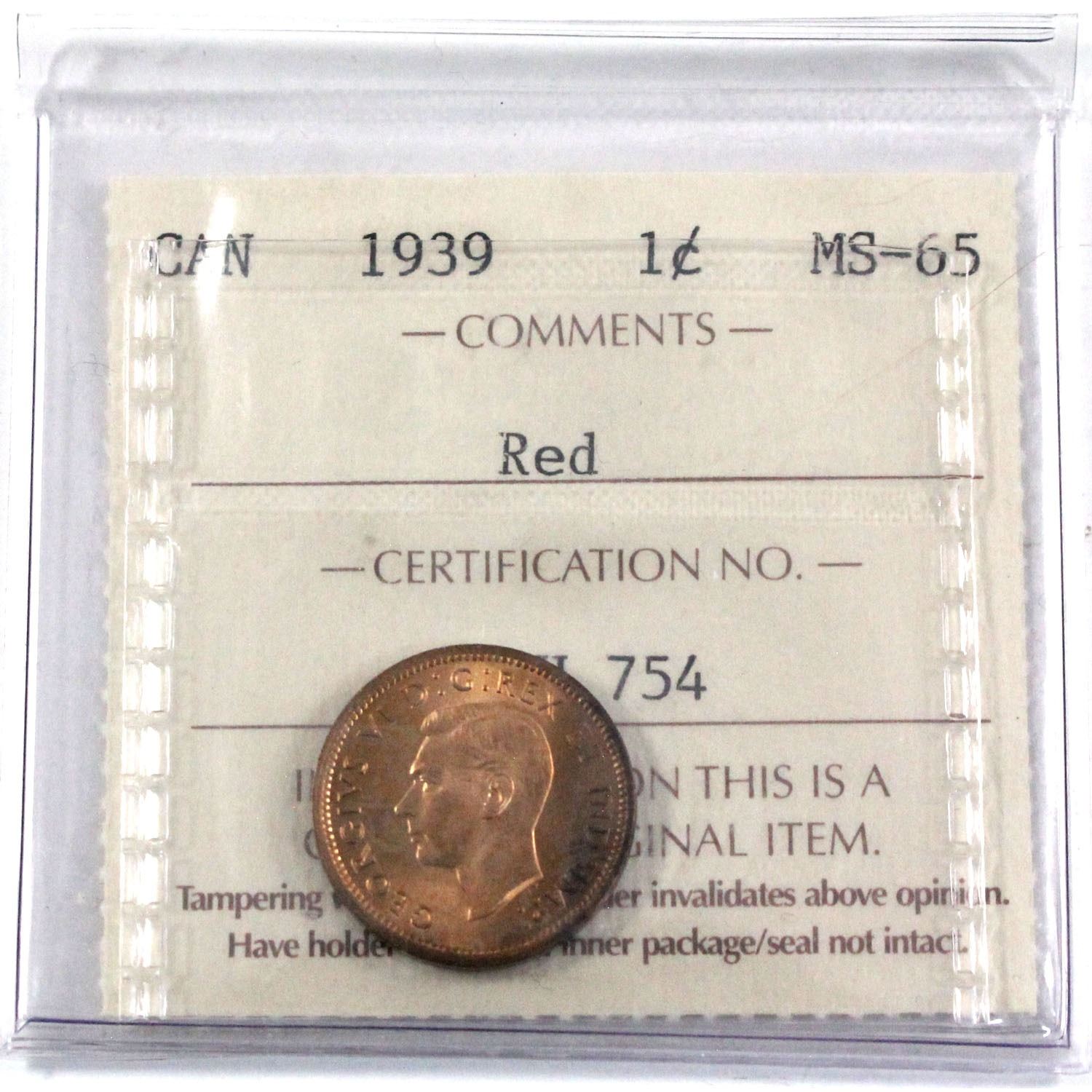 1939 Canada 1-cent ICCS Certified MS-65