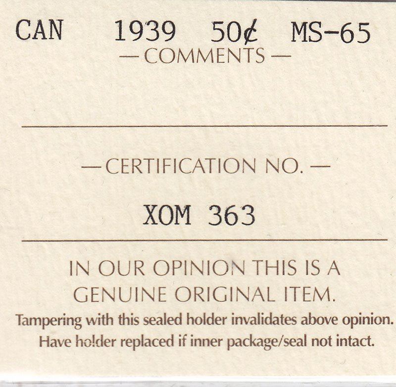 1939 Canadian Silver 50-Cent Half Dollar Coin - ICCS Graded MS-65!!!