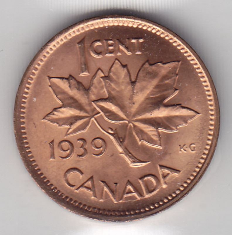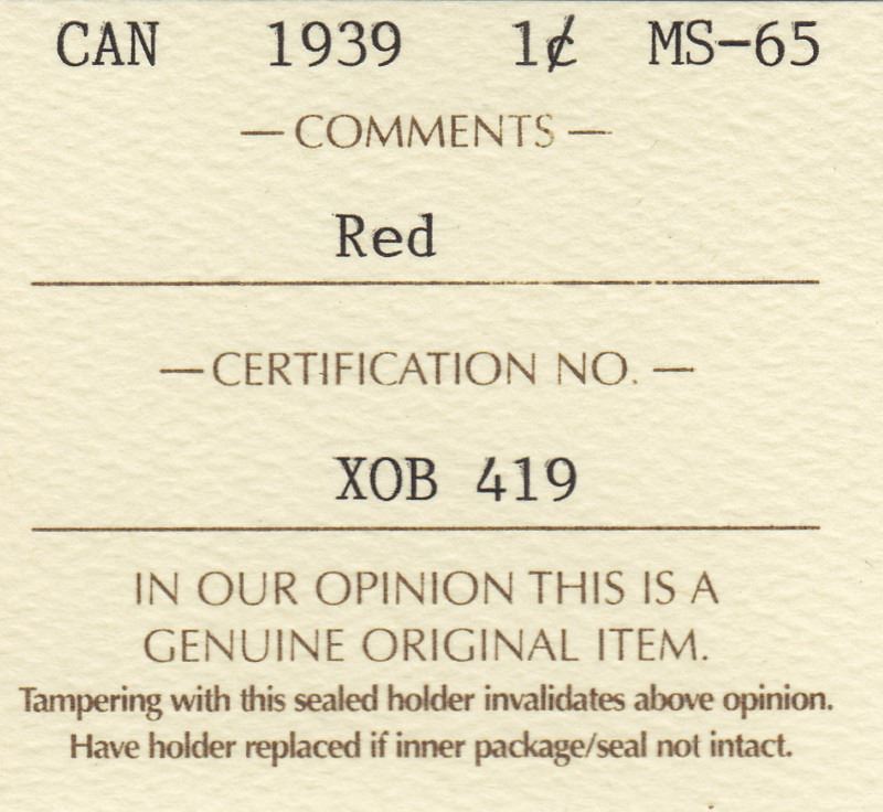 1939 Canadian Small One Cent Penny Coin - Graded MS-65 by ICCS; Red (XOB 419)