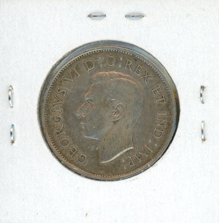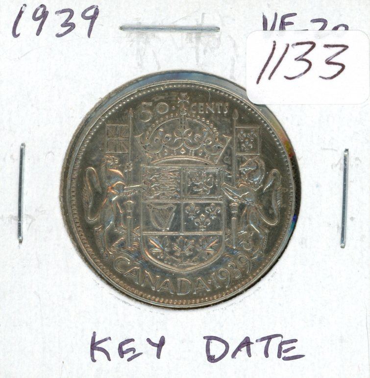 1939 Canadian Silver 50 Cents. First year of World War II. Key Date. Mintage of 287,976. VF-20.