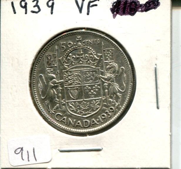 1939 Canadian Silver 50 Cents. Key Date. Mintage of 287,976. First year of World War II. VF-20.