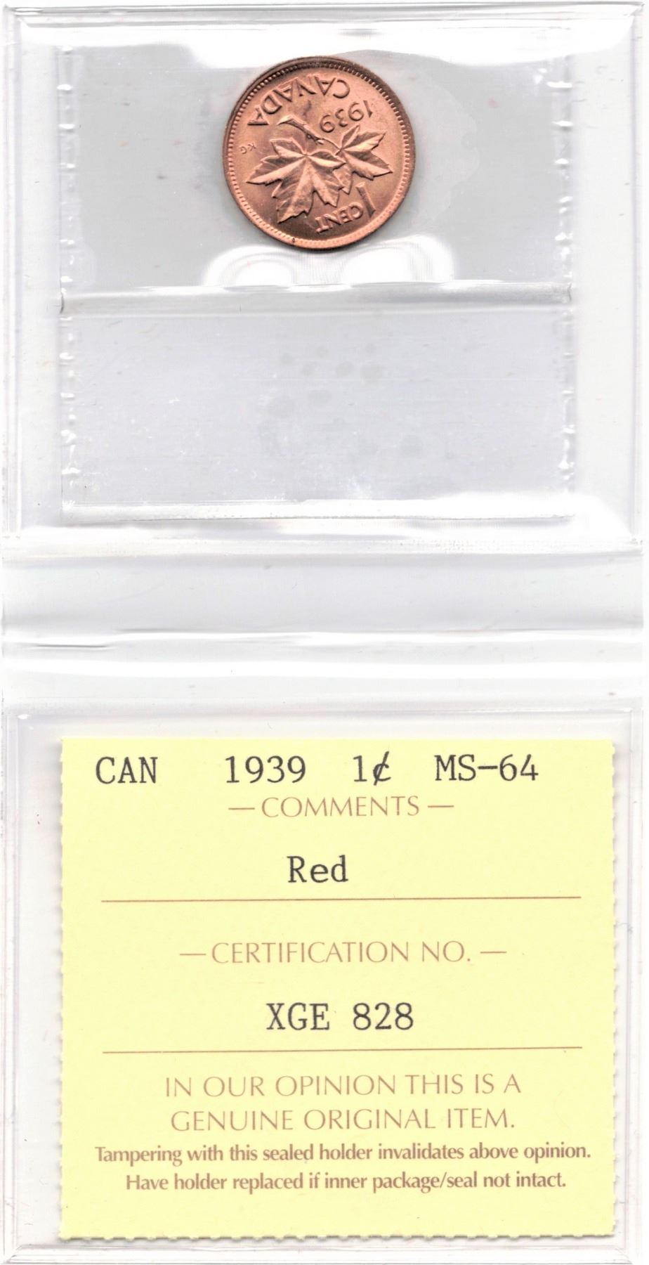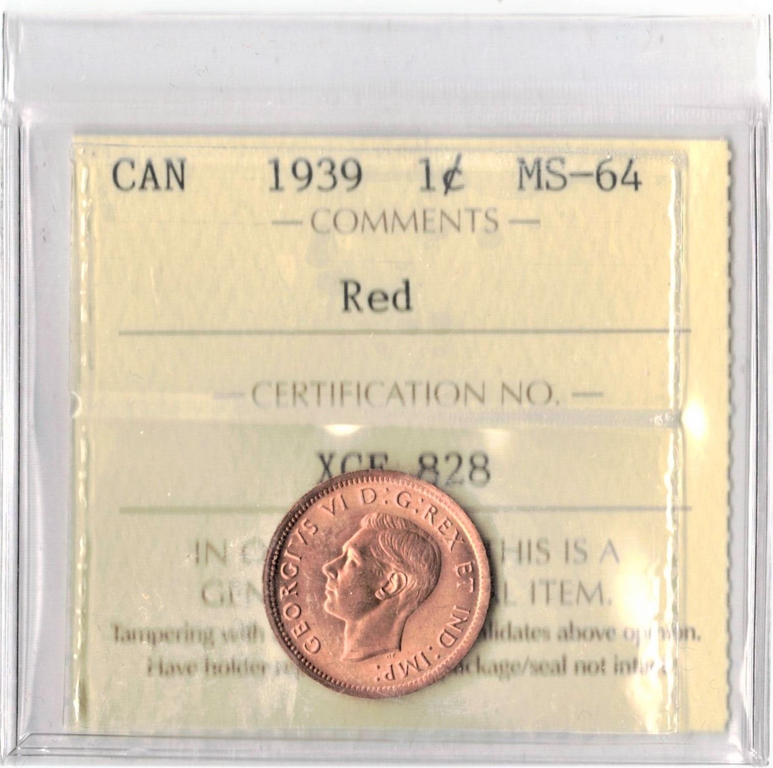 1939 Canadian Small Cent ICCS Graded MS-64 RED
