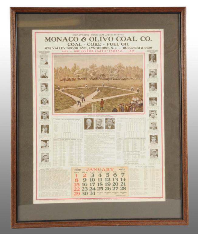 Copyrighted 1938 with 1939 full pad. Advertisement for the Monaco & Olivo Coal Co. of New Jersey. Framed under glass. Condition (Excellent). Size 25" x 20 - 1/2".