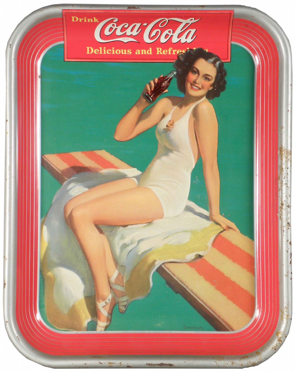 1939 Coca Cola Tin Serving Tray. Sundblom image of girl in white bathing suit. Some edge ware otherwise excellent condition. 10 1/2 X 13 inches.