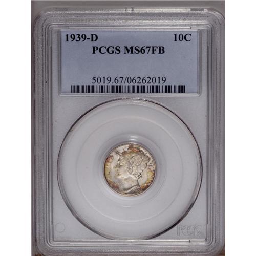 <B>1939-D 10C MS67 Full Bands PCGS.</B></I> Each side offers original iridescent peripheral toning with russet, indigo, and sea-green, the reverse adding some steel-blue. The reverse is essentially free of mentionable distractions, while a glass reveals a light, short scratch along the jawline. An attractive Superb Gem example.