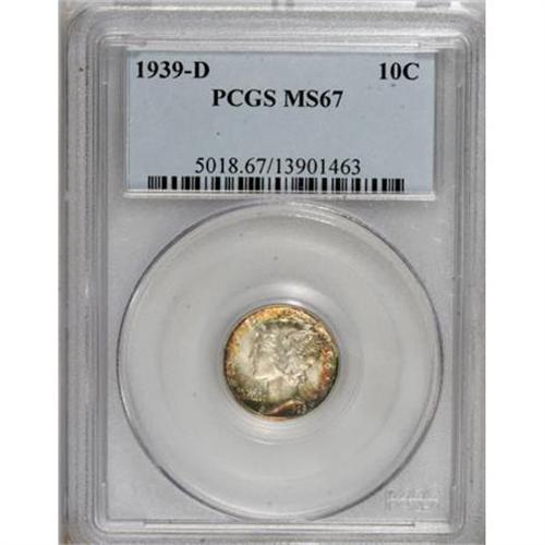 <B>1939-D 10C MS67 PCGS.</B></I> PCGS Population (117/3). NGC Census: (218/5). Mintage: 24,394,000. Numismedia Wsl. Price for NGC/PCGS coin in MS67: $85. (#5018)<BR><BR><B>Coin Engraver:</B> Adolph A. Weinman<BR><BR><b>Shipping:</b> Coins & Currency (<a target="_blank" href="http://www.heritageauctions.com/common/shipping.php">view shipping information</a>)