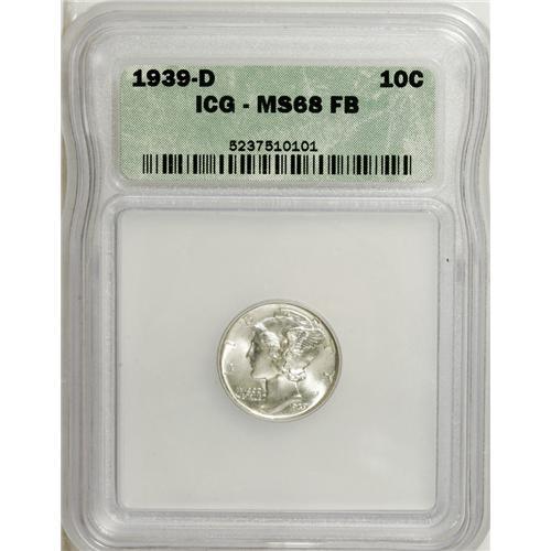 <B>1939-D 10C MS68 Full Bands ICG.</B></I> NGC Census: (58/6). PCGS Population (80/14). Mintage: 24,394,000. Numismedia Wsl. Price for NGC/PCGS coin in MS68: $850. (#5019)<BR><BR><b>Shipping:</b> Coins & Currency (<a target="_blank" href="http://www.heritageauctions.com/common/shipping.php">view shipping information</a>)