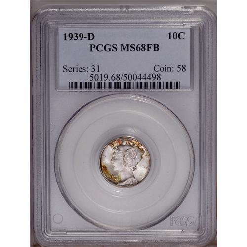 <B>1939-D<10C> MS68 Full Bands PCGS.</B></I> A remarkably preserved '39-D dime. Both sides exhibit a radiant, frosty sheen with untoned centers that give way to splendid aqua, orange, and rose iridescence splashes on the obverse and a more mundane charcoal-brown toning on the left part of the reverse.