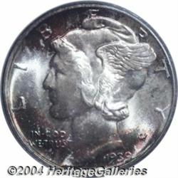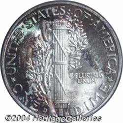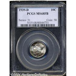 <B>1939-D<10C> MS68 Full Bands PCGS.</B></I> This is a magical Gem, well struck with near-flawless surfaces, and displaying bright rich toning on both sides, with colors including deep crimson, emerald-green, and antique-gold. A perfectly original example. Population: 73 in 68, 13 finer (7/04). <BR><BR><B>Important notice:</B> Heritage usually auctions material at the rate of 200-250 lots per hour. On some occasions eBay Live bid software or the Internet may not be able to keep up with the pace of the auction. We recommend placing a realistic absentee bid now as insurance to avoid disappointment. Occasionally the auctioneer may eliminate or reject an eBay Live bid, and the auctioneer may also reopen a lot after the close of the eBay live bidding (usually because we missed an audience bid), and may reject your bid even if it shows you as the winning bidder. By bidding via eBay Live, you agree that Heritage may award the lot to another bidder at its sole discretion under the circumstances described above or any other reasonable circumstances. Since eBay bids are not shown to us until we open the lot on the floor, we treat those bids just like floor bids. In most cases the floor responds before the eBay bid is presented to us, due to Internet lag time, so for consistency we have made it a policy that floor bids are always considered first over tie eBay live bids. Also please note that all Heritage lots purchased through eBay Live carry a 20% Buyer's Premium. Please make sure you read the Terms and Conditions before you bid. </span></font></tr></table></td></tr></table>