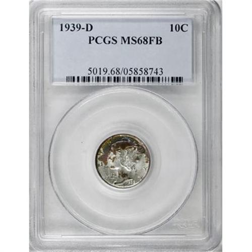<B>1939-D 10C MS68 Full Bands PCGS.</B></I> Intensely lustrous surfaces display splashes of aqua-green, purple, and golden-brown patina. Powerfully struck, culminating in full Bands. Immaculately preserved, as expected for the grade designation. Population: 83 in 68 Full Bands, 14 finer (3/08).<BR><BR><B>Coin Engraver:</B> Adolph A. Weinman<BR><BR><b>Shipping:</b> Coins & Currency (<a target="_blank" href="http://www.heritageauctions.com/common/shipping.php">view shipping information</a>)