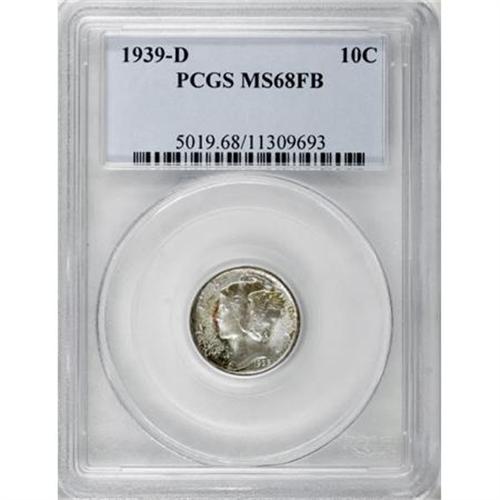 <B>1939-D 10C MS68 Full Bands PCGS.</B></I> A shining, sharply struck, and virtually pristine example, decisively struck with splashes of gold and orange patina over otherwise silver-white surfaces. PCGS has graded 14 finer Full Bands pieces (3/08).<BR><BR><B>Coin Engraver:</B> Adolph A. Weinman<BR><BR><b>Shipping:</b> Coins & Currency (<a target="_blank" href="http://www.heritageauctions.com/common/shipping.php">view shipping information</a>)