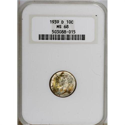 <B>1939-D 10C MS68 NGC.</B></I> NGC Census: (5/0). PCGS Population (3/0). Mintage: 24,394,000. (#5018)<BR><BR><B>Coin Engraver:</B> Adolph A. Weinman<BR><BR><b>Shipping:</b> Coins & Currency (<a target="_blank" href="http://www.heritageauctions.com/common/shipping.php">view shipping information</a>)