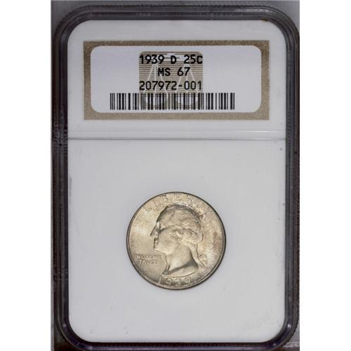 <B>1939-D<25C> MS67 NGC.</B></I> Splashes of pastel apricot and mauve toning embrace this lustrous and suitably struck Superb Gem. A low mintage early branch mint issue. Census: 46 in 67, 0 finer (1/06).<BR><I>From The Houston Collection of Washington Quarters.</B></I>