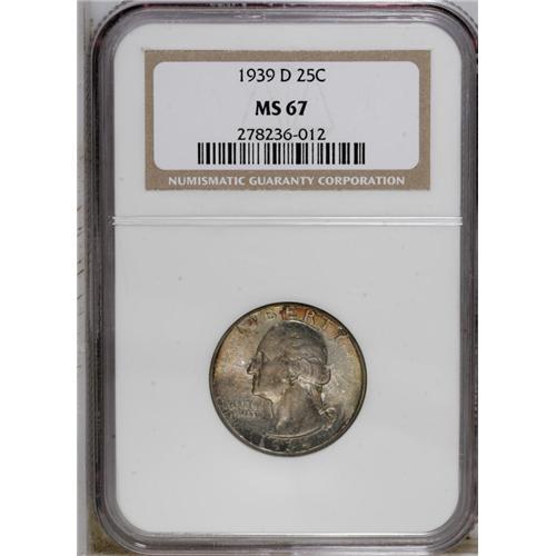 <B>1939-D 25C MS67 NGC.</B></I> Swirling violet, gray, and tan patina covers the highly lustrous surfaces and boldly impressed devices. This remarkable Superb Gem is tied for the finest certified by either NGC or PCGS (9/06).<BR><BR><b>Shipping:</b> Coin/Currency (<a target="_blank" href="http://www.heritageauctions.com/common/shipping.php">view shipping information</a>)