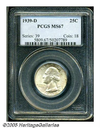 <B>1939-D<25C> MS67 PCGS.</B></I> Fully lustrous surfaces reveal a thin coating of gold-beige and ice-blue patination, overlain with a few splotches of darker golden-green color at the upper obverse. The design elements are well impressed throughout, and the surfaces display no evidence of significant marks. As of May 2005, neither PCGS or NGC have certified any 1939-Ds finer. Population: 34 in 67, 0 finer (5/05).