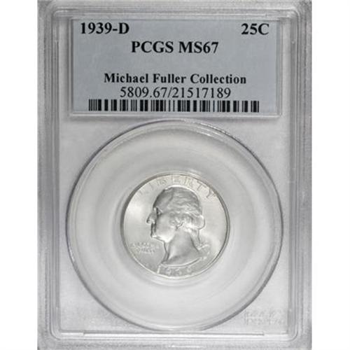 <B>1939-D 25C MS67 PCGS.</B></I> Immensely lustrous with a faint blush of color in the outer obverse fields. The strike is sharp, and the overall eye appeal of the piece is impressive. Population: 40 in 67, 0 finer (8/07). <BR><I>From The Michael Fuller Collection.</B></I><BR><BR><B>Coin Engraver:</B> John Flanagan<BR><BR><b>Shipping:</b> Coins & Currency (<a target="_blank" href="http://www.heritageauctions.com/common/shipping.php">view shipping information</a>)