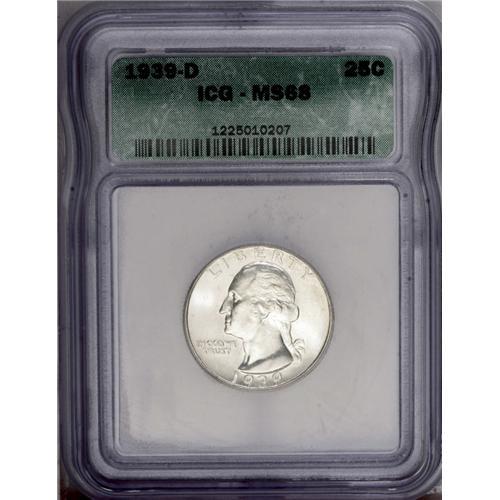 <B>1939-D<25C> MS68 ICG.</B></I> Whispers of ice-blue and faint tan patination are visible under magnification on this highly lustrous Superb Gem. The surfaces are well preserved, revealing just a couple of miniscule marks near Washington's eye.<BR><I>From The Houston Collection of Washington Quarters.</B></I>