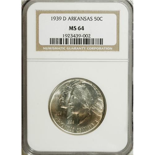 <B>1939-D 50C Arkansas MS64 NGC.</B></I> NGC Census: (171/160). PCGS Population (219/228). Mintage: 2,104. Numismedia Wsl. Price for NGC/PCGS coin in MS64: $352. (#9250)<BR><BR><b>Shipping:</b> Coins & Currency (<a target="_blank" href="http://www.heritageauctions.com/common/shipping.php">view shipping information</a>)