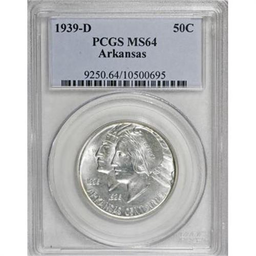 <B>1939-D 50C Arkansas MS64 PCGS.</B></I> PCGS Population (221/235). NGC Census: (175/163). Mintage: 2,104. Numismedia Wsl. Price for NGC/PCGS coin in MS64: $352. (#9250)<BR><BR><b>Shipping:</b> Coins & Currency (<a target="_blank" href="http://www.heritageauctions.com/common/shipping.php">view shipping information</a>)