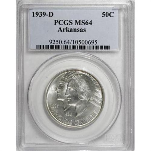 <B>1939-D 50C Arkansas MS64 PCGS.</B></I> PCGS Population (223/237). NGC Census: (176/164). Mintage: 2,104. Numismedia Wsl. Price for NGC/PCGS coin in MS64: $352. (#9250)<BR><BR><b>Shipping:</b> Coins & Currency (<a target="_blank" href="http://www.heritageauctions.com/common/shipping.php">view shipping information</a>)