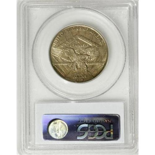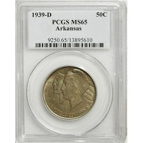 <B>1939-D 50C Arkansas MS65 PCGS.</B></I> The 1939 Philadelphia Arkansas from the DuVall collection is sold under lot 10085. The 1939-S Arkansas from the DuVall collection is sold under lot 10133. PCGS Population (160/68). NGC Census: (126/36). Mintage: 2,104. Numismedia Wsl. Price for NGC/PCGS coin in MS65: $900. (#9250)<BR><I>From The Frank DuVall Collection of U.S. Commemoratives.</B></I><BR><BR><b>Shipping:</b> Coins & Currency (<a target="_blank" href="http://www.heritageauctions.com/common/shipping.php">view shipping information</a>)