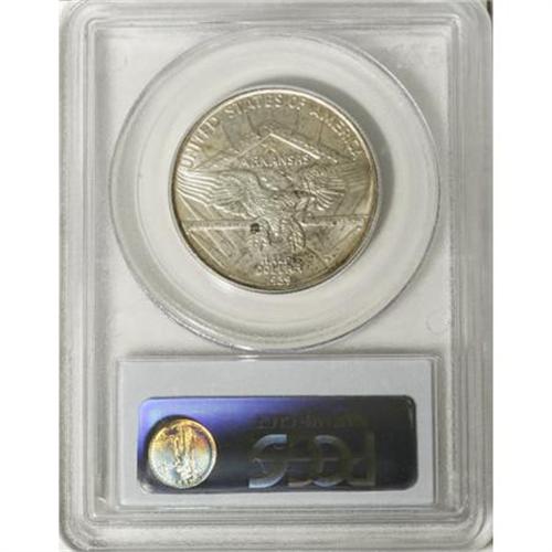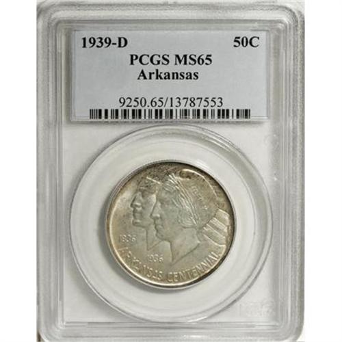<B>1939-D 50C Arkansas MS65 PCGS.</B></I> PCGS Population (167/67). NGC Census: (127/36). Mintage: 2,104. Numismedia Wsl. Price for NGC/PCGS coin in MS65: $900. (#9250)<BR><BR><b>Shipping:</b> Coins & Currency (<a target="_blank" href="http://www.heritageauctions.com/common/shipping.php">view shipping information</a>)