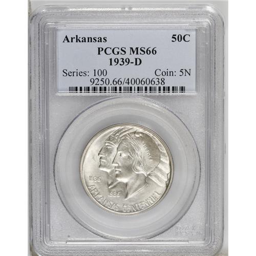 <B>1939-D 50C Arkansas MS66 PCGS.</B></I> Lustrous and largely untoned with above-average detail. At 2,104 pieces coined, this issue is one of the lowest-mintage commemoratives. Population: 57 in 66, 5 finer (10/06).<BR><BR><b>Shipping:</b> Coin/Currency (<a target="_blank" href="http://www.heritageauctions.com/common/shipping.php">view shipping information</a>)