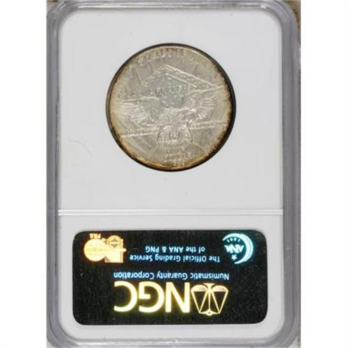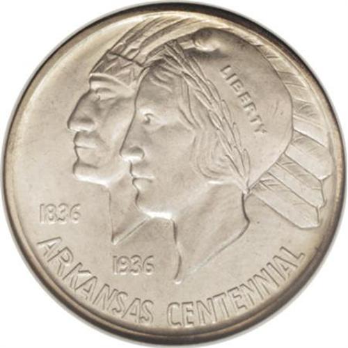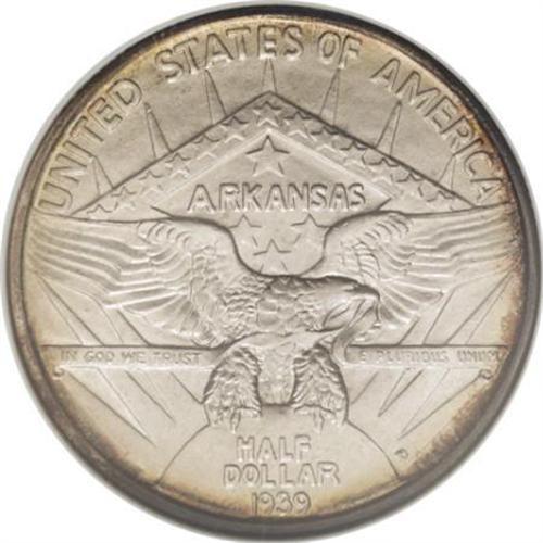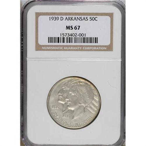 <B>1939-D 50C Arkansas MS67 NGC.</B></I> A sliver of golden-tan, lavender, and light green toning clings to the reverse margins, framing the silver-gray center, while the obverse displays just whispers of light color around the periphery, along with occasional faint streaks of russet. The design elements are well impressed, and both sides have been well cared for. From a small mintage of 2,104 pieces. Census: 7 in 67, 0 finer (5/07).<BR><BR><b>Shipping:</b> Coins & Currency (<a target="_blank" href="http://www.heritageauctions.com/common/shipping.php">view shipping information</a>)