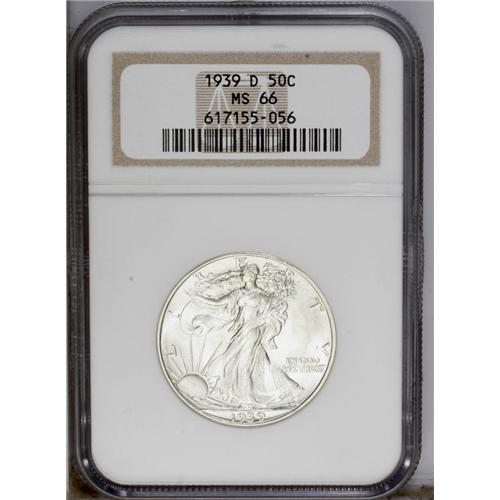 <B>1939-D<50C> MS66 NGC.</B></I> A brilliant, lustrous Premium Gem with frosty luster and near-pristine fields, although a few light ticks can be seen under a loupe. The eye appeal is quite high on this lovely coin. NGC has graded 53 specimens finer (3/06). <BR><BR><B>Important notice:</B> Heritage usually auctions material at the rate of 200-250 lots per hour. On some occasions eBay Live bid software or the Internet may not be able to keep up with the pace of the auction. We recommend placing a realistic absentee bid now as insurance to avoid disappointment. Occasionally the auctioneer may eliminate or reject an eBay Live bid, and the auctioneer may also reopen a lot after the close of the eBay live bidding (usually because we missed an audience bid), and may reject your bid even if it shows you as the winning bidder. By bidding via eBay Live, you agree that Heritage may award the lot to another bidder at its sole discretion under the circumstances described above or any other reasonable circumstances. Since eBay bids are not shown to us until we open the lot on the floor, we treat those bids just like floor bids. In most cases the floor responds before the eBay bid is presented to us, due to Internet lag time, so for consistency we have made it a policy that floor bids are always considered first over tie eBay live bids. Also please note that all Heritage lots purchased through eBay Live carry a 20% Buyer's Premium. Please make sure you read the Terms and Conditions before you bid. This lot is being auctioned in conjunction with a live floor auction by Heritage Galleries & Auctioneers. All final auction and invoice information will be supplied by Heritage Galleries & Auctioneers, and all other information should be considered preliminary. Lot:2978 <BR><BR><B>Winning Notification and Billing:</B> After the FINAL session in this auction is complete, Heritage will send e-mail and snail mail invoices. This process normally takes several days. All final auction and invoice information will be supplied by Heritage Galleries & Auctioneers, and all other information should be considered preliminary. <BR><BR>This auction will be conducted on a live auction floor and over the Internet through eBay Live. If you choose to place an absentee bid, please take a moment to <font color='#0000ff'><u><a href='http://pages.ebay.com/liveauctions/help/before/laabsentee.html'>learn how eBay Live absentee bidding works</a></u></font><font color='#000000'>