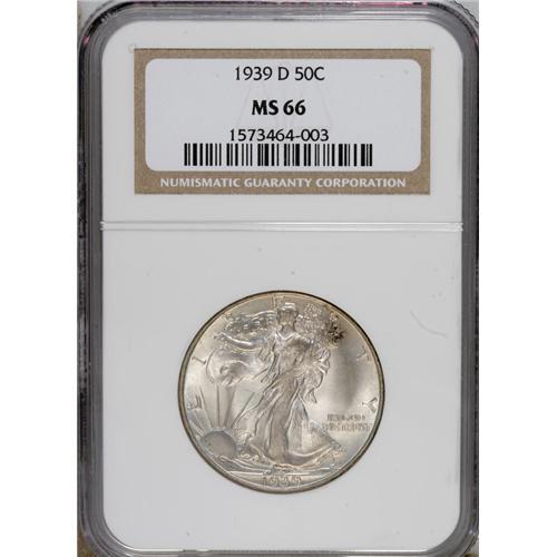 <B>1939-D 50C MS66 NGC.</B></I> NGC Census: (980/118). PCGS Population (606/46). Mintage: 4,267,800. Numismedia Wsl. Price for NGC/PCGS coin in MS66: $520. (#6607)<BR><BR><b>Shipping:</b> Coins & Currency (<a target="_blank" href="http://www.heritageauctions.com/common/shipping.php">view shipping information</a>)