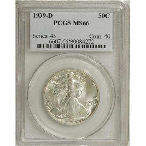 <B>1939-D 50C MS66 PCGS.</B></I> PCGS Population (616/46). NGC Census: (496/59). Mintage: 4,267,800. Numismedia Wsl. Price for NGC/PCGS coin in MS66: $520. (#6607)<BR><BR><B>Coin Engraver:</B> Adolph A. Weinman<BR><BR><b>Shipping:</b> Coins & Currency (<a target="_blank" href="http://www.heritageauctions.com/common/shipping.php">view shipping information</a>)