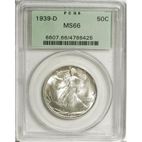 <B>1939-D 50C MS66 PCGS.</B></I> PCGS Population (616/46). NGC Census: (496/59). Mintage: 4,267,800. Numismedia Wsl. Price for NGC/PCGS coin in MS66: $520. (#6607)<BR><BR><B>Coin Engraver:</B> Adolph A. Weinman<BR><BR><b>Shipping:</b> Coins & Currency (<a target="_blank" href="http://www.heritageauctions.com/common/shipping.php">view shipping information</a>)