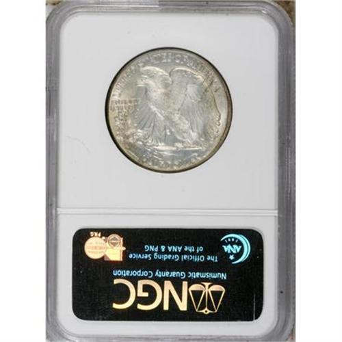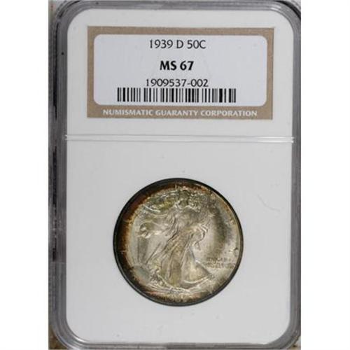 <B>1939-D 50C MS67 NGC.</B></I> 1939-D half dollars can be located through MS65, and even Premium Gems are obtainable with a little patience. MS67 examples are more elusive, and finer-graded coins are rare. An arc of deep green, gold, and purple toning rests along the left obverse border of this Superb Gem. Lustrous surfaces exhibit sharply struck motifs, including good definition on Liberty's left hand and adjacent branches. Well preserved on both sides. Census: 57 in 67, 2 finer (7/07).<BR><BR><B>Coin Engraver:</B> Adolph A. Weinman<BR><BR><b>Shipping:</b> Coins & Currency (<a target="_blank" href="http://www.heritageauctions.com/common/shipping.php">view shipping information</a>)