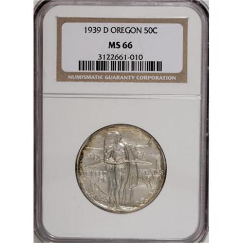 <B>1939-D 50C Oregon MS66 NGC.</B></I> Whispers of golden-brown gravitate to the margins of this Oregon commemorative. Lustrous surfaces exhibit well struck design elements, and are devoid of mentionable marks.<BR><I>From The John Stimson, Sr. Collection, Part Two.</B></I><BR><BR><b>Shipping:</b> Coins & Currency (<a target="_blank" href="http://www.heritageauctions.com/common/shipping.php">view shipping information</a>)