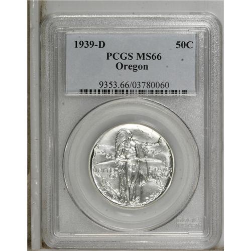 <B>1939-D 50C Oregon MS66 PCGS.</B></I> PCGS Population (298/131). NGC Census: (259/169). Mintage: 3,004. Numismedia Wsl. Price for NGC/PCGS coin in MS66: $700. (#9353)<BR><BR><b>Shipping:</b> Coins & Currency (<a target="_blank" href="http://www.heritageauctions.com/common/shipping.php">view shipping information</a>)
