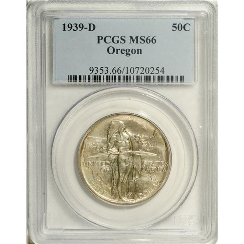 <B>1939-D 50C Oregon MS66 PCGS.</B></I> Wisps of violet, rose, and orange grace the lustrous surfaces of this attractive Oregon Trail half. With 13 years between the first and last issues, this commemorative series ran longer than numerous designs and more than one denomination.<BR><BR><b>Shipping:</b> Coins & Currency (<a target="_blank" href="http://www.heritageauctions.com/common/shipping.php">view shipping information</a>)