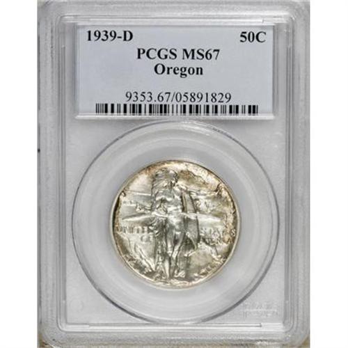 <B>1939-D 50C Oregon MS67 PCGS.</B></I> This frosty Superb Gem has extraordinary eye appeal created by light champagne toning and stronger peripheral iridescence. PCGS has only certified 15 finer examples of this issue (10/07).<BR><BR><b>Shipping:</b> Coins & Currency (<a target="_blank" href="http://www.heritageauctions.com/common/shipping.php">view shipping information</a>)