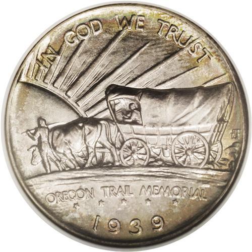 1939-D 50C Oregon MS68 NGC. Sea-green, gold, and lilac