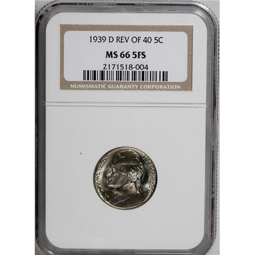 <B>1939-D<5C> Reverse of 1940 MS66 5FS NGC.</B></I> Five of the six steps of Monticello are distinct, while the last is nearly so. A boldly impressed coin with great luster and lilac-blue patina.