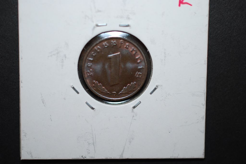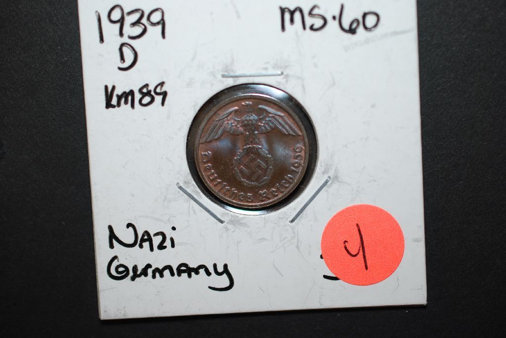 1939-D German 1 Reichspfennig Foreign Coin With Flying Eagle Holding Swatstika; MS60; EST. $10-15