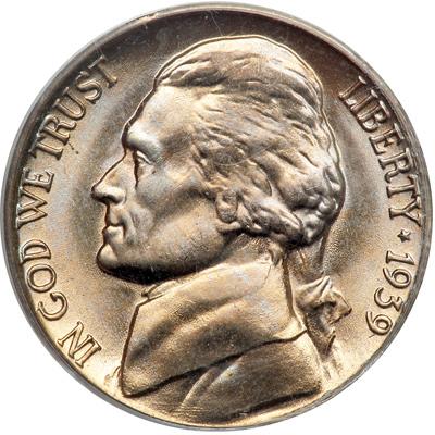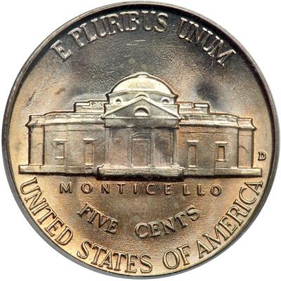 1939-D Jefferson 5¢. PCGS graded MS-66 PQ. Reverse of 1938. Nicely toned. Pop 483; 67 finer in 67 (PCGS # 4005) .