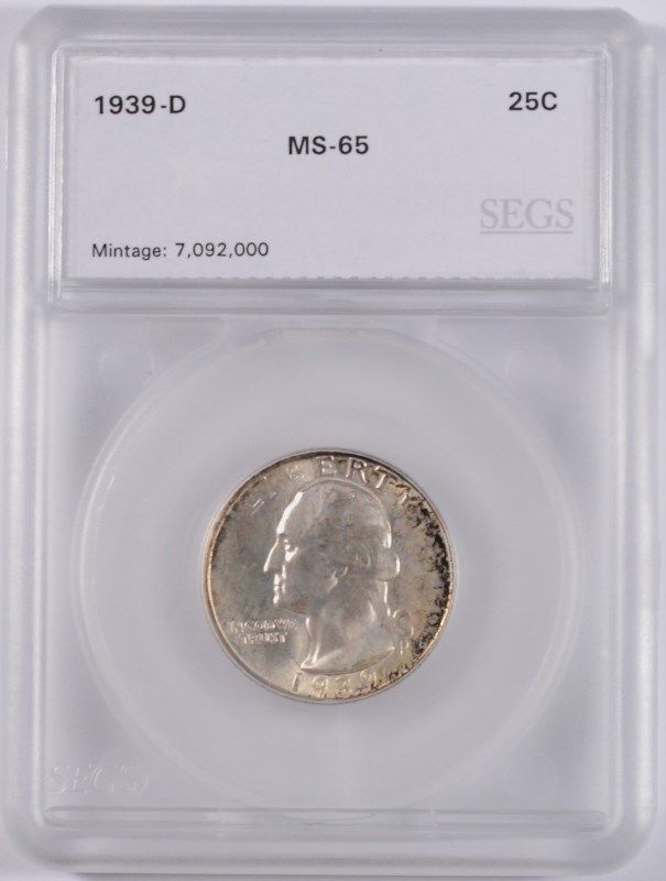 1939-D WASHINGTON QUARTER, SEGS MS-65, GEM