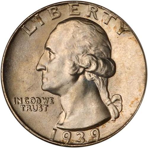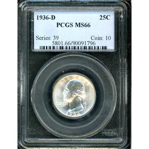 <b>1939-D Washington Quarter Dollar. NGC graded MS67.</b> From one side to the other the luminous silvery luster glows with fiery brilliance. A superb specimen of the D-mint issue for 1939, the year of the New York World's Fair. The fair attracted large crowds to Flushing Meadow Park in Queens. Many of the people who came liked not only the fair, but Queens borough as well. Communities Forest Hills and Elmhurst sprang up after the war <b>(PCGS # 5809)</b>