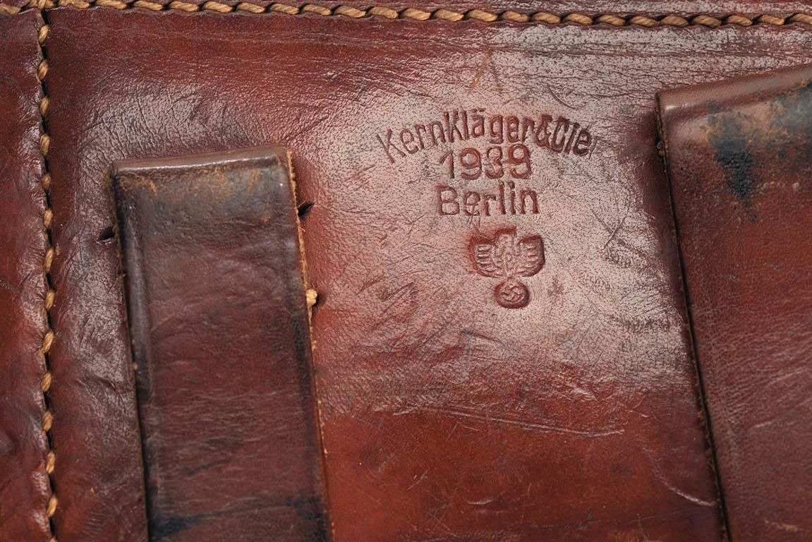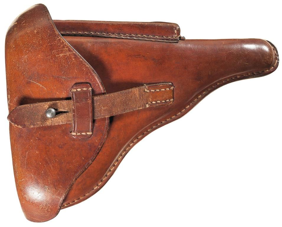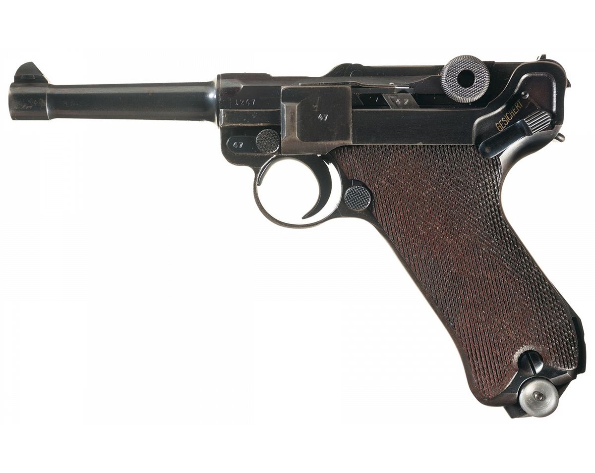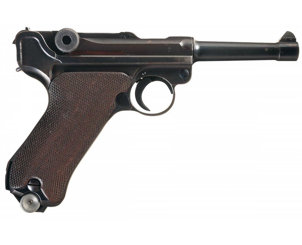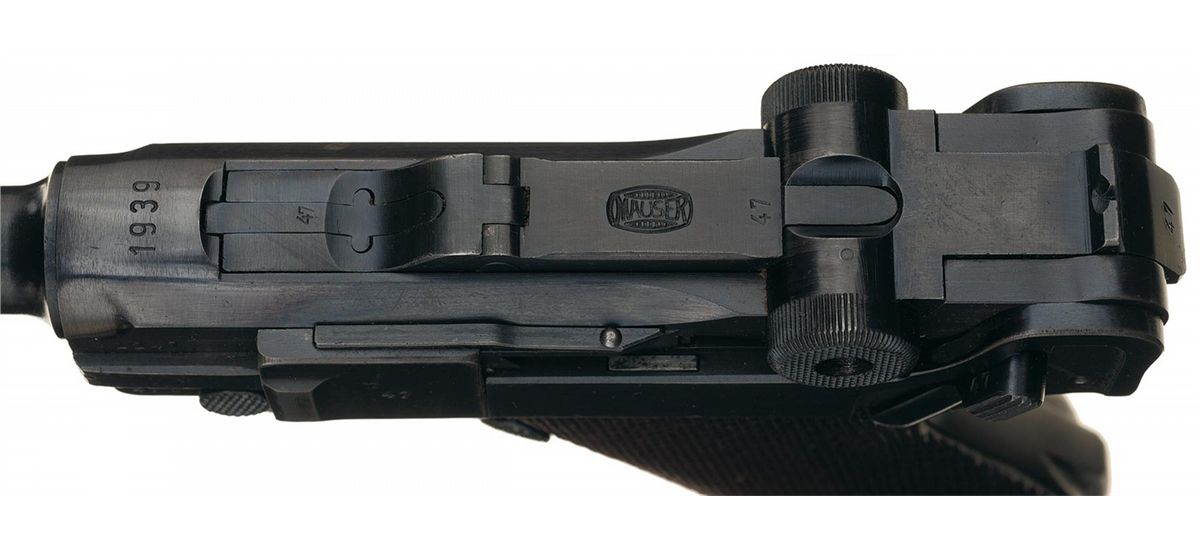 This is an excellent example of an early 1939 dated Mauser Banner Police Luger pistol rig with the scarce "Eagle/C" Police proof. These were produced in a very short production run (1,360 total) in early 1939 before Mauser switched to the standard "Eagle/L" Police proof. The top of the chamber area is lightly stamped "1939" for the year of manufacture with the large Mauser Banner logo on the front toggle. The scarce early "Eagle/C" Police proof is stamped on the right side of the receiver, along with an equally rare "Simson/Eagle 6" part proof, indicating this barrel extension was a subcontract part from the Simson Company. The left side of the barrel extension and breech bolt both have the commercial "Crown/U" proofmark. The full serial number "1247w" is stamped on the front of the frame, with "1247" stamped and the left side of the barrel extension, and underside of the barrel with the last two digits of the serial number (47) stamped on the various small parts. The pistol has a salt blue finish and checkered walnut grips. This beautiful Police Luger rig is complete with two matching all blued Haenel Schmeisser marked magazines. The aluminum base are marked, "1/1247" and "2/1247". It is complete with a brown leather Police holster, marked on the back "KERN KLAGER & Cie/1939/BERLIN/Police Eagle" proofmark and an "Eagle/63" proofed takedown tool.