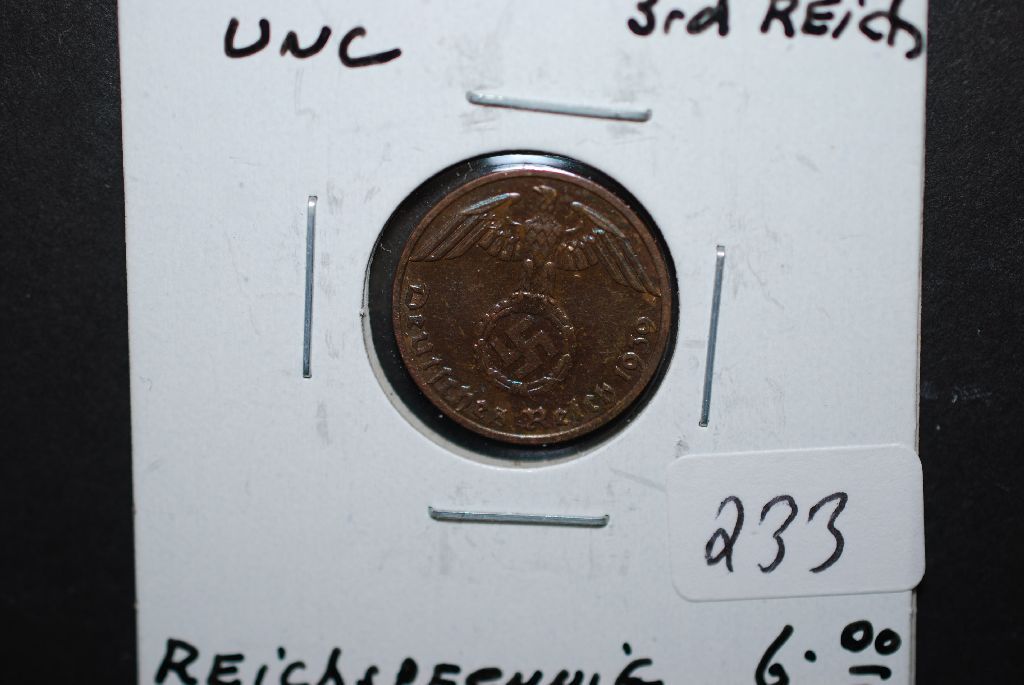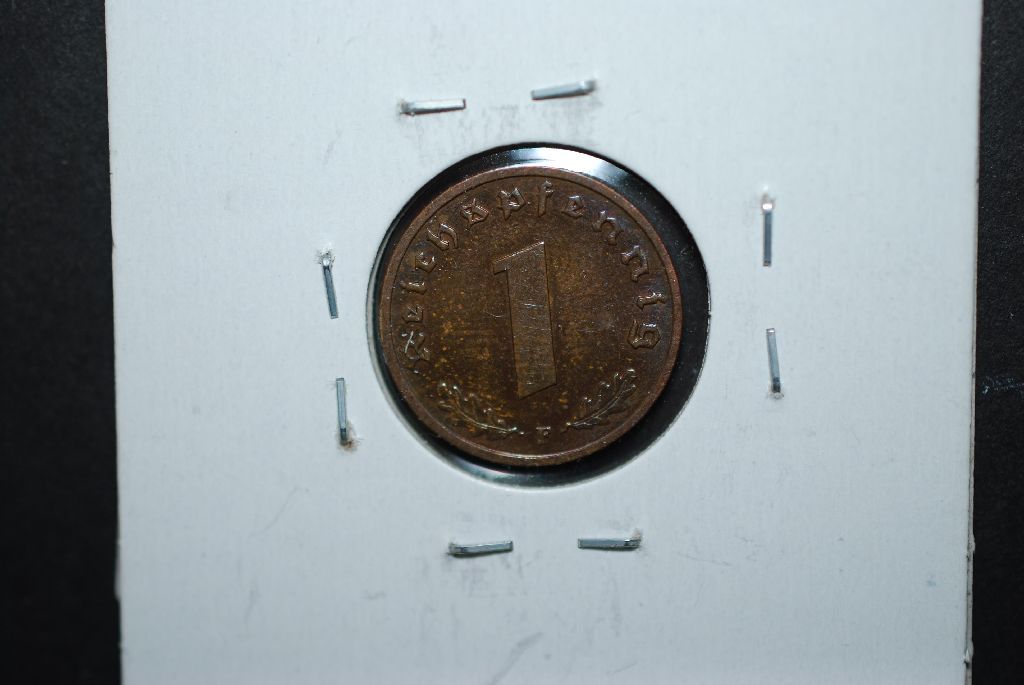 1939-F German 1 Reichspfennig Foreign Coin With Flying Eagle Holding Swatstika; UNC; EST. $10-15
