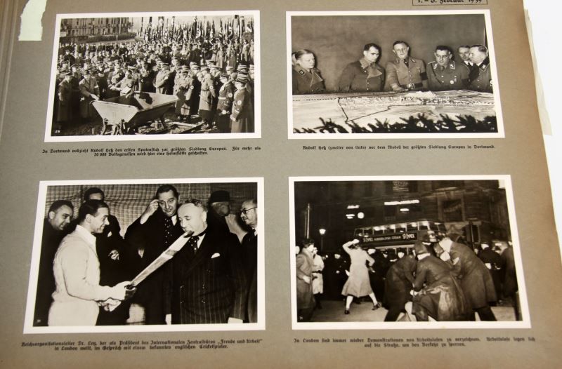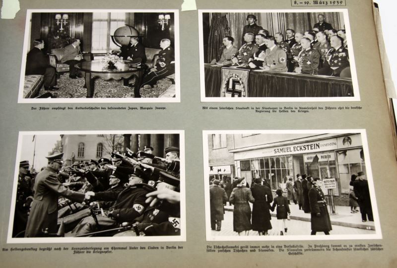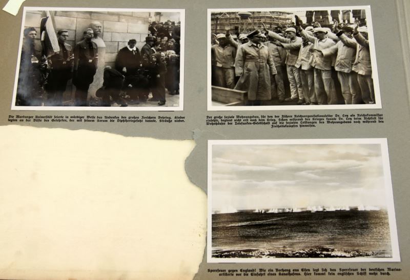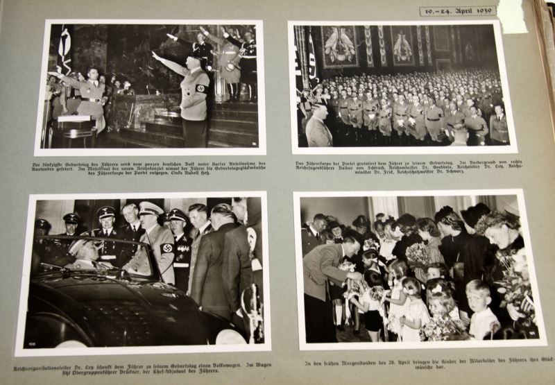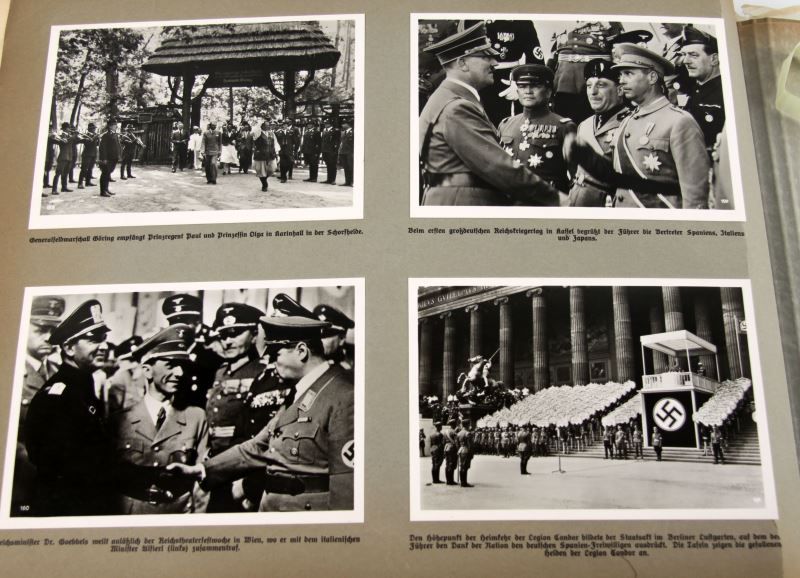 Great Germany in World Events 1939 photographic album by Hoffmann Presse, a yearbook of German political and military events which is presented chronologically with dates given on each page. Photographs are of significant political and military events. Featuring fifty double-sided pages, 368 high-quality silver gelatin photographs (three to four per page). Four photographs have been removed from this edition. Each photograph is individually captioned with detailed descriptions in German. Includes photographs of NSDAP party leaders, Wehrmacht soldiers and officers, and similar content. Wear present on hard-board outer cover and missing rivet, otherwise in very good condition. All photographs are in excellent condition. This lot has a reserve.