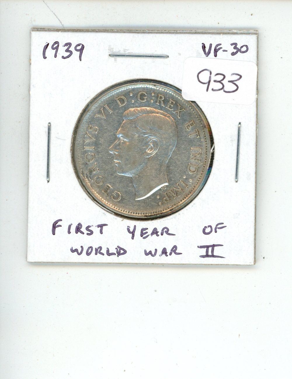 1939 George VI Silver 50 Cents. Key Date. Mintage of 287,976. First year of World War II. VF-30. Nice.